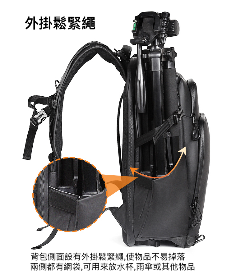 三腳架/腳架固定:左側口袋搭配綁帶,可穩固綁定 三腳架或獨腳架。