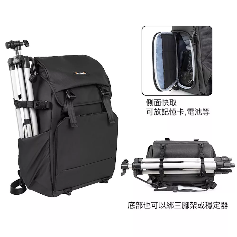 ✓側袋可裝三腳架/雨傘等物品, 三腳架也可以綁在背包底部