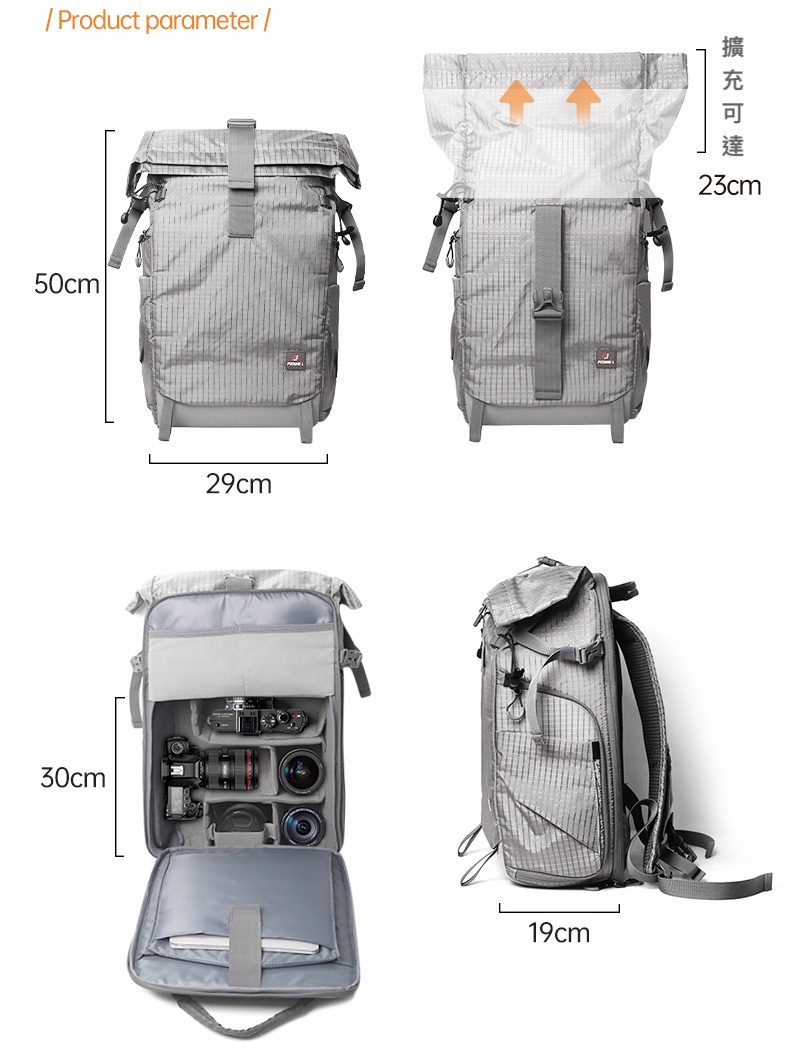 ✓背包外部尺寸: 高50x長29x 寬19cm. 內部攝影設備空間: 30x25x15cm,重量1.26KGS