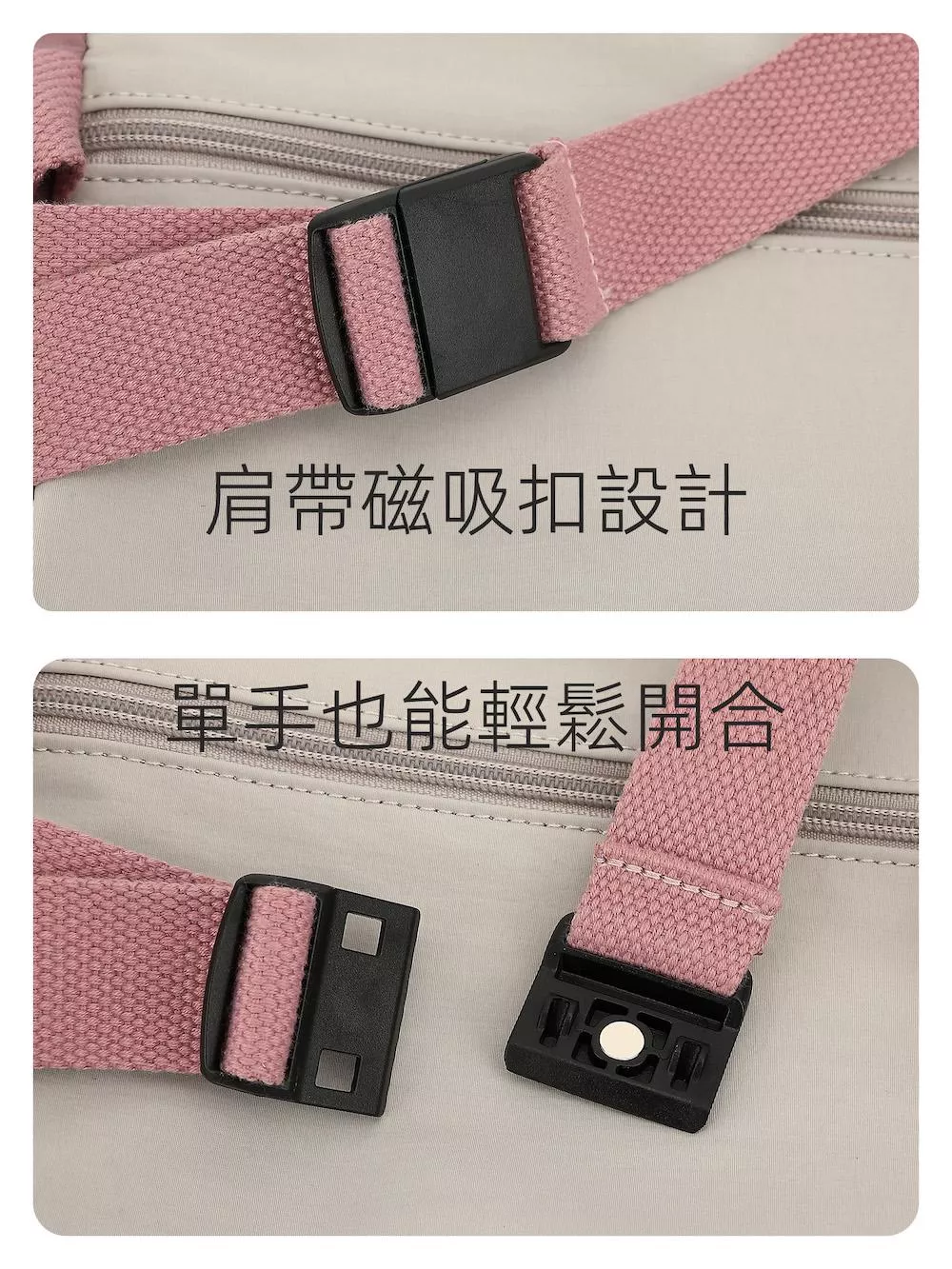 【磁吸式肩帶扣設計】:獨特磁吸快扣,單手即可輕鬆開合肩帶,帥氣又高效。